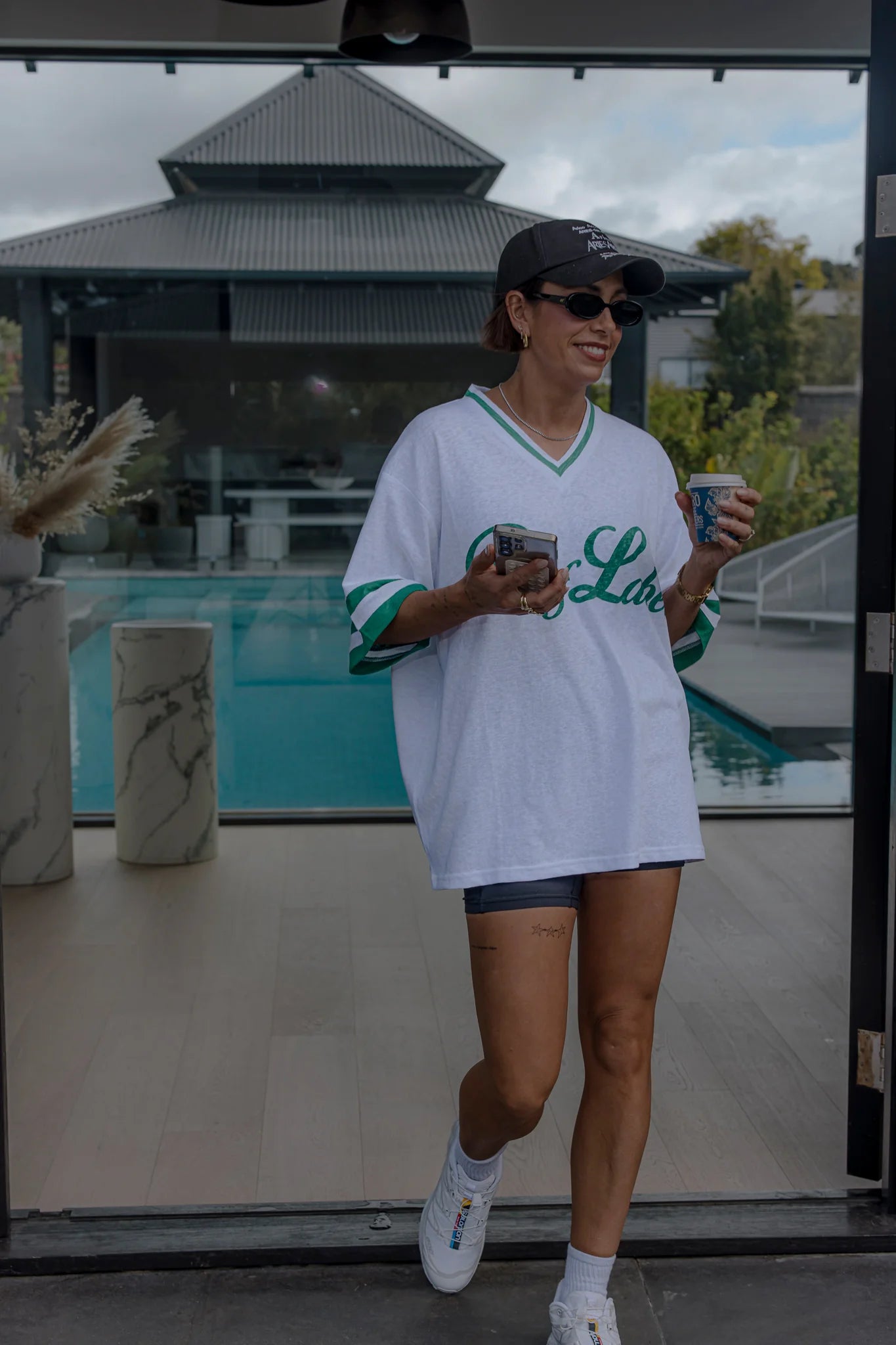 The Est. Raef Graphic Tee in white is a statement piece with a sporty edge. Made from a jersey Slub. It features a bold Raef Label logo across the chest, contrast green sleeve stripes, and a retro-inspired v-neckline. With its relaxed, oversized fit, this tee is perfect for throwing on with your go-to denim or wide leg pants for a casual-cool look.