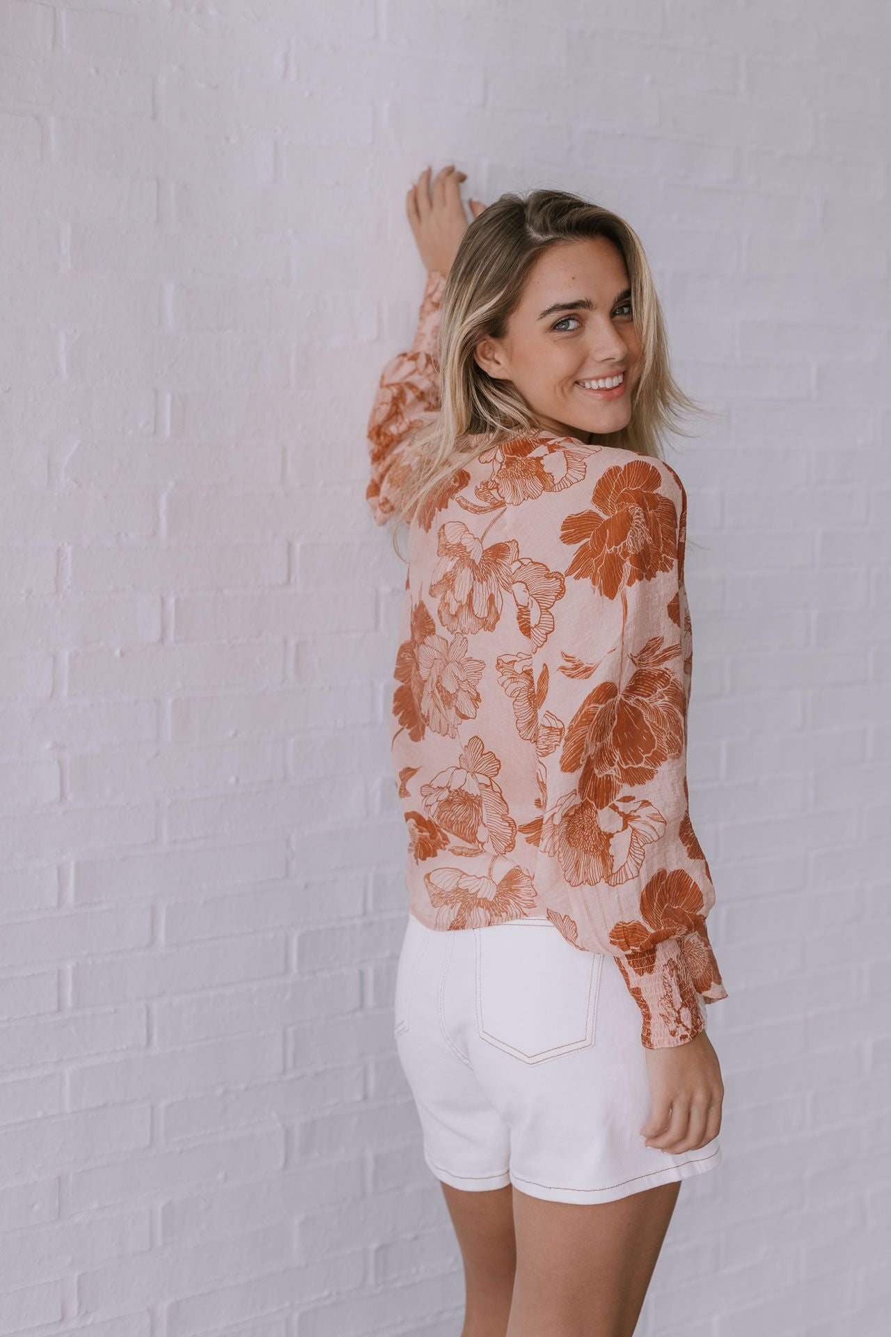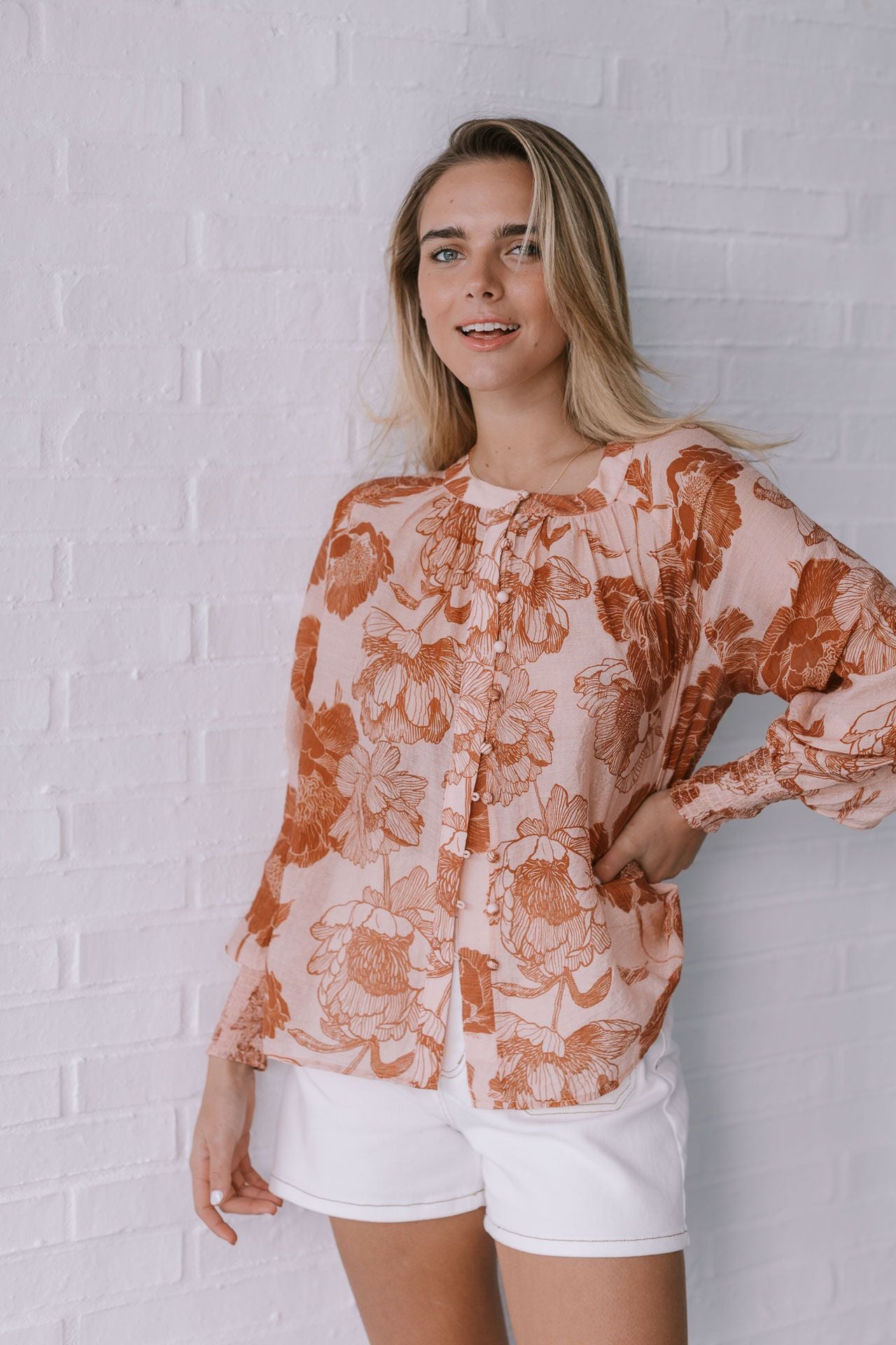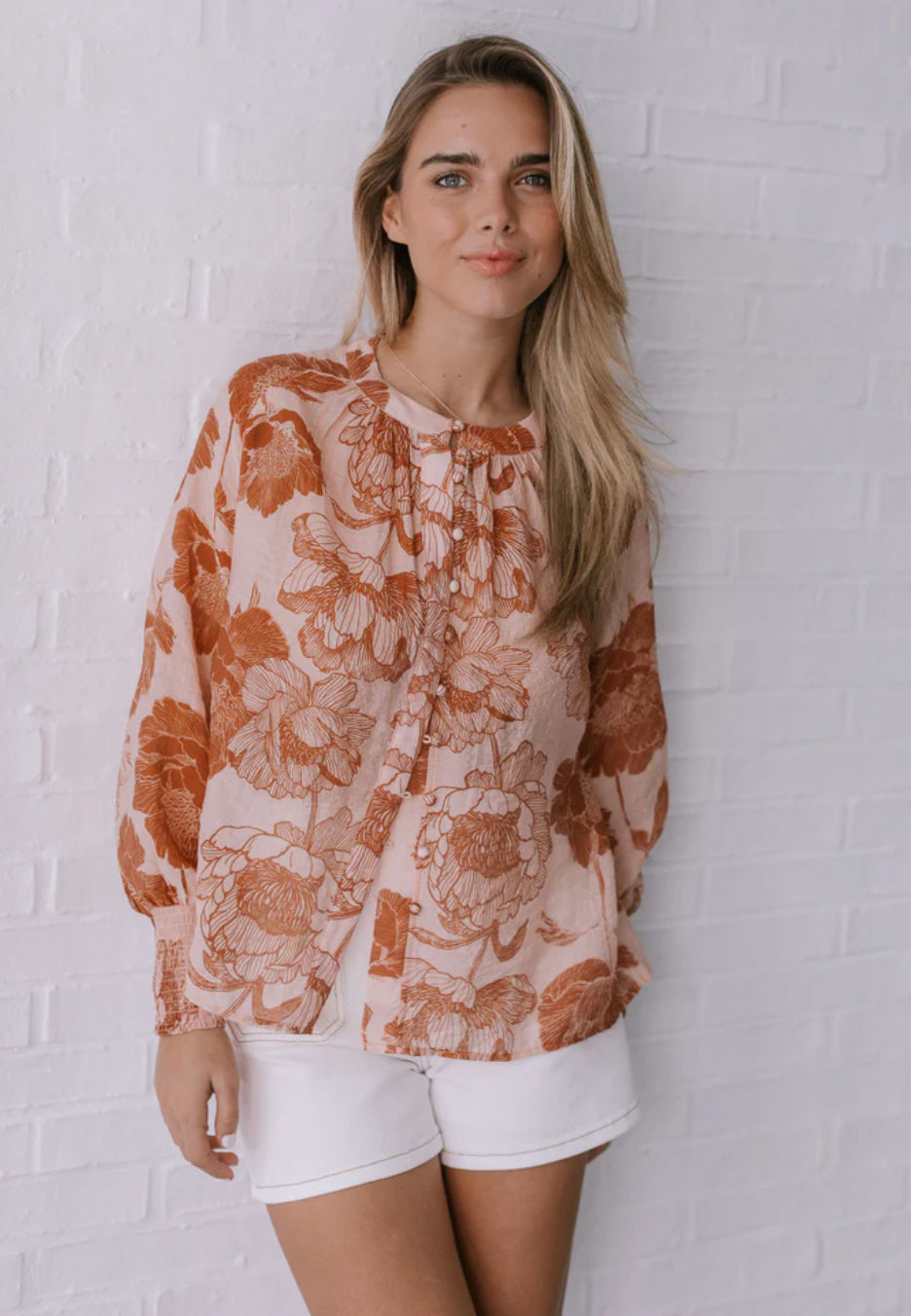 Meet the Tuscan Flower Top — a timeless blend of soft femininity and effortless style. Featuring dreamy peach and tan hues with delicate floral line art, this blouse is the perfect piece to take you from workdays to weekend getaways. Designed with a flattering high round neckline (that can also be worn open), fabric-covered buttons, and elasticated cuffs, it offers comfort and sophistication in one.